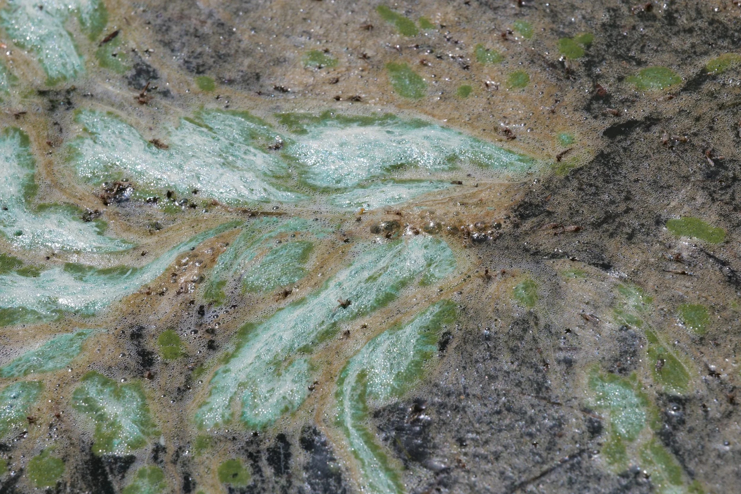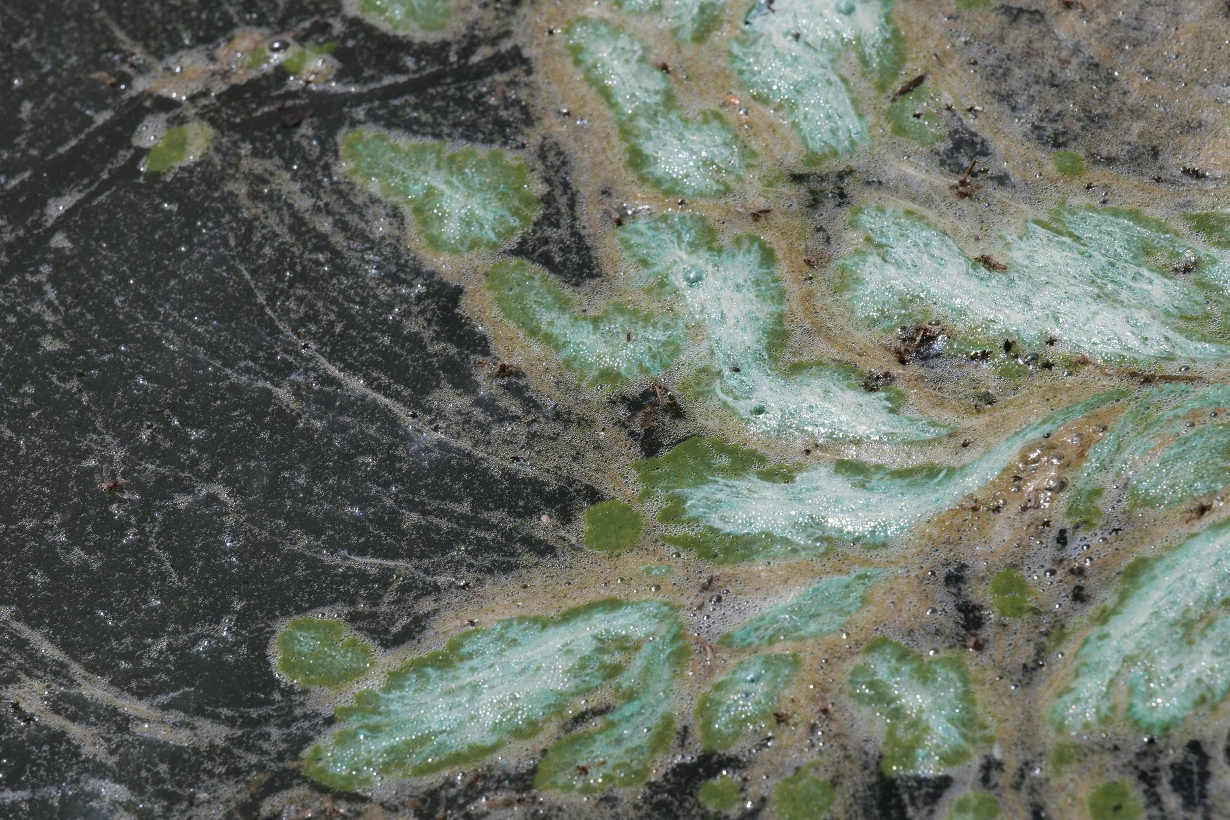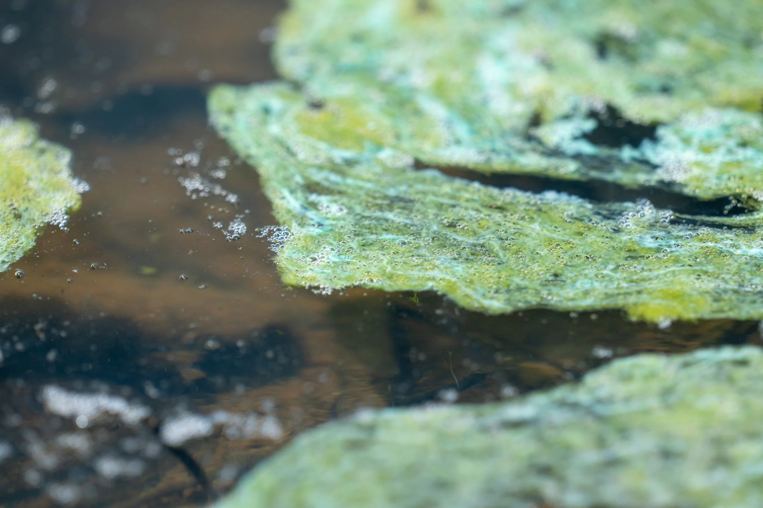 I am fascinated by the colors, patterns, and dynamic shapes created by algae and other substances that collect and circulate at the water’s surface. When framed just right, it can create images that feel otherworldly-like the atmosphere of a gas giant, or the painting of an Impressionist. I find it intriguing to reflect on the similar physical phenomena and forces that lead to the formation of these patterns within fluids in such disparate places. Below is my ongoing series in which I attempt to capture and convey the hidden beauty within mundane scum.